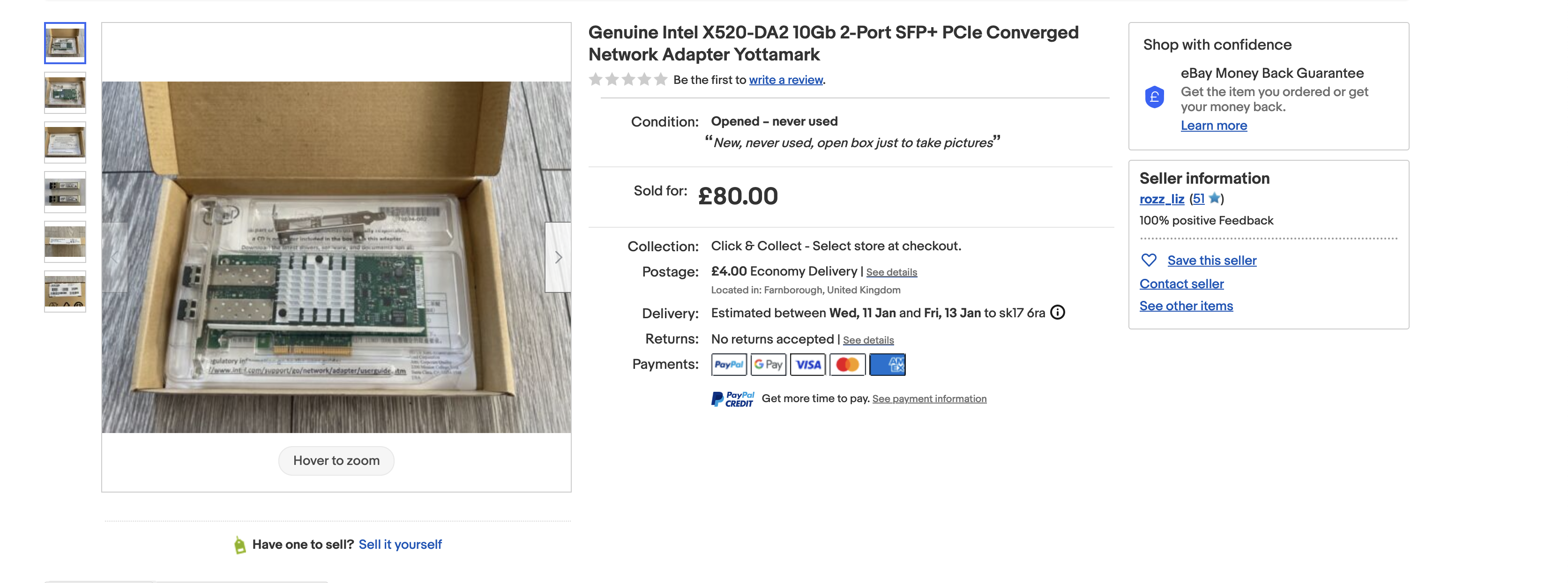 I found a seller which had the NIC and the Intel SFP’s already as a complete set, apparently unused in its entirety. This costs £80, but in all would be much easier and require less waiting for other deliveries. Added bous was the genuiine intel SFP’s meaning compatability wouldn’t be an issue.
