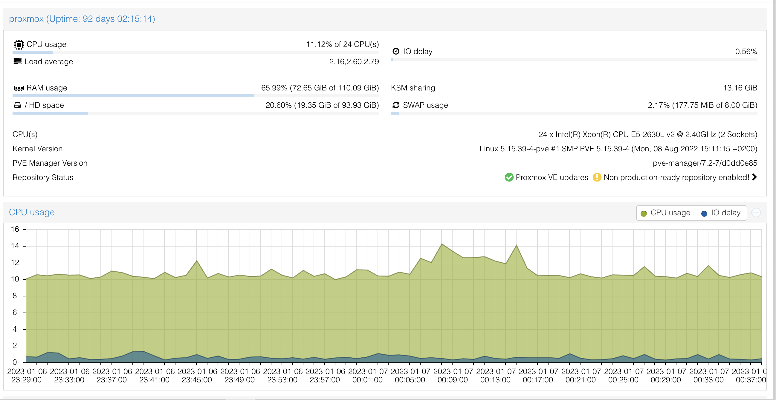 - 2x Intel(R) Xeon E5-2630L v2 @ 2.40GHz (6c 12t)